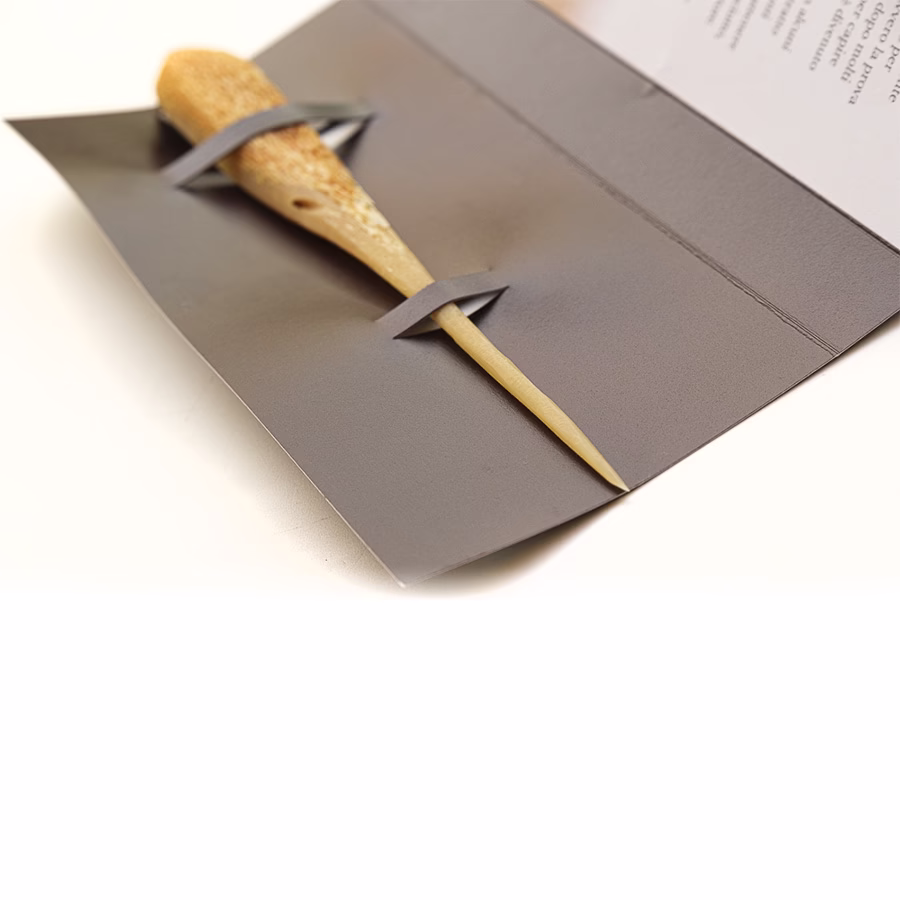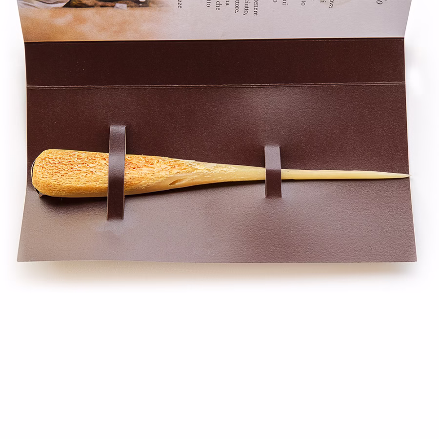 Sottile, appuntito e molto poroso, permette di intrappolare l’aroma interno del Prosciutto di San Daniele e di trasferirlo al naso esperto dell’artigiano.