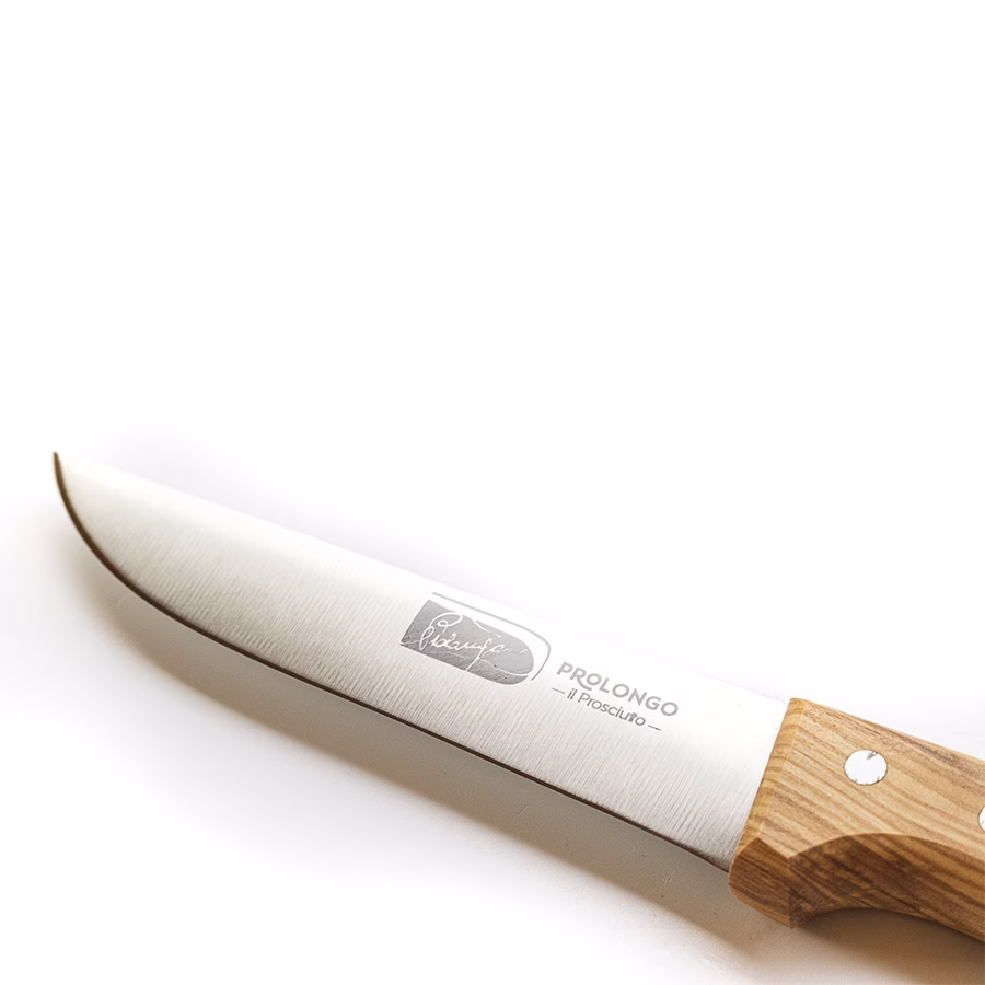Un coltello affilato e dalla lama ampia, perfetto per rifilare la cotenna dei Prosciutti interi o dei tranci.