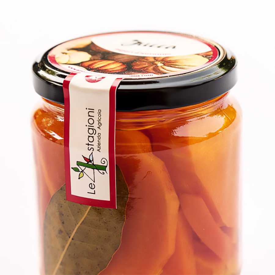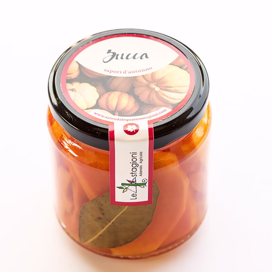 Ingredienti: zucca 66%, olio di semi di girasole, vino bianco, aceto di vino bianco, zucchero, sale, alloro.